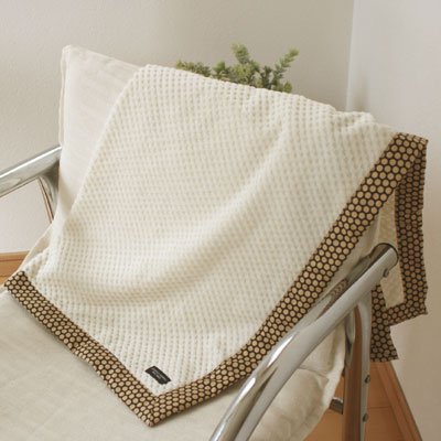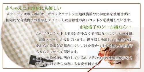 通常の綿毛布は起毛をかけたものが一般的ですが、このプチケットは毛抜けが少なく毛玉になりにくいシール織で出来ています。