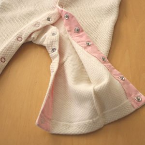 前開きスナップが足までついているので、オムツ替えの際は股のスナップを外すだけで簡単にオムツ替えができ、お着換えの際も前ボタンが全開するのでねんねしながらお着換えさせることが可能です。