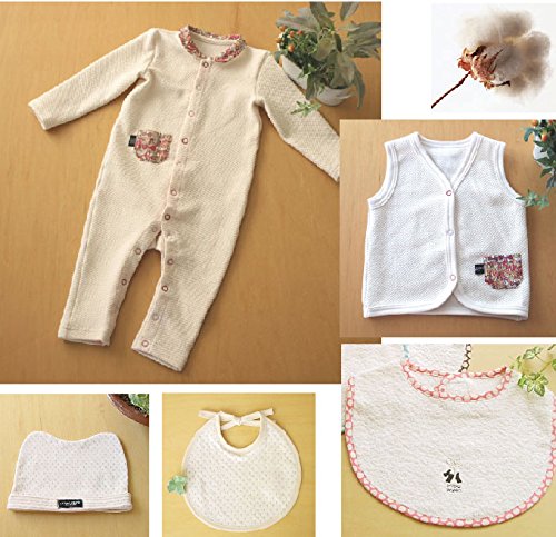 - セット内容:襟付きカバーオール(襟部にドット生地使用)、ベストナチュラル(ポケットとふちどりにドット生地使用)、パイルスタイ、ニットスタイ、ニットキャップ 5点セット