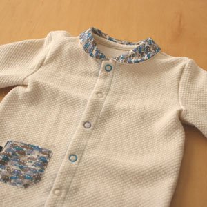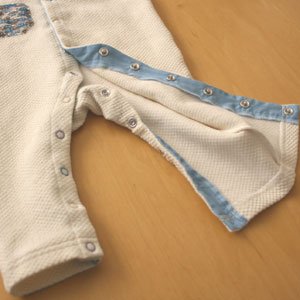 前開きスナップが足までついているので、オムツ替えの際は股のスナップを外すだけで簡単にオムツ替えができ、お着換えの際も前ボタンが全開するのでねんねしながらお着換えさせることが可能です。