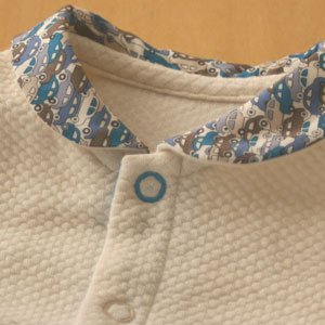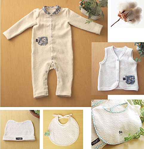 - セット内容:襟付きカバーオール(襟部にドット生地使用)、ベストナチュラル(ポケットとふちどりにドット生地使用)、パイルスタイ、ニットスタイ、ニットキャップ 5点セット
