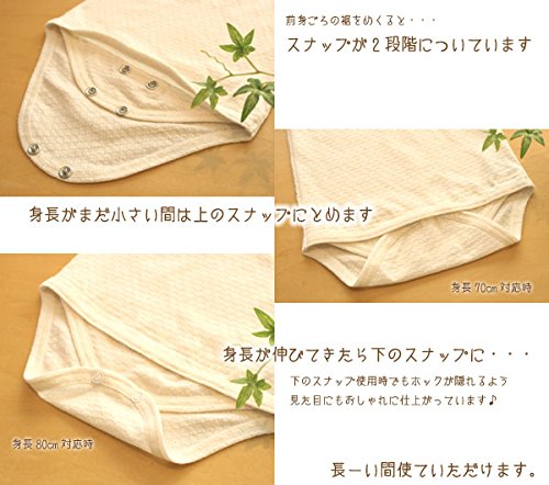 でも成長が早く、すぐに着られなくなってしまうこともしばしば、そんなお悩みを解決すべく当店が開発たのが、リングスナップが2段階になっていて、成長の早い赤ちゃんでも、長い間ご使用いただけるロンパースです。