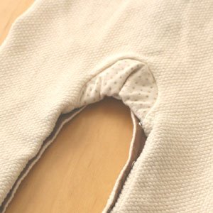 漂白していない原綿のままの生成り色なので、生地にポツポツとした斑点が残っています。これは、糸にする段階で取り除ききれなかった綿花の葉や茎の残りですから、害はありません。洗濯するごとに減っていきます。