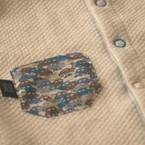ダイヤモンドキルトのカバーオールはポケットにリバティファブリックを使用しています。 リングスナップのカラーもマルチに配置しているのがおしゃれです。