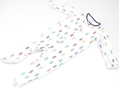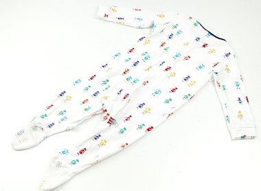 実際のサイズ表記は9-12mです。毛羽立ちがあり、肩に洗濯ばさみの跡があり、足元に毛玉があります。後ろの右太もも部分に5mm程の薄茶色の汚れがあります。たくさん必要なベビーサイズ、洗い替え用にいかがでしょうか?足裏に滑り止めが付いています。