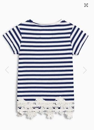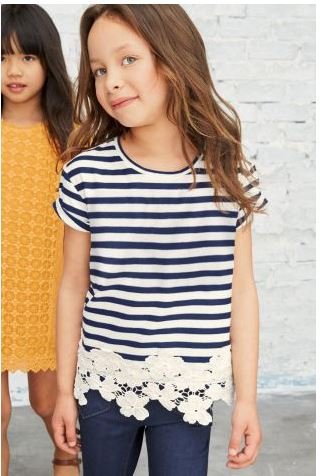 ボーダーのかわいい半袖Tシャツが入荷しました! ネクストらしくシンプルなデザインですが、裾に大きめの花のレースがついていて、オシャレ! まわりと差がつく1枚です! 【商品詳細】 ●素材:綿100% ●サイズ:3T,4T,5T,6T,11T ●注意点: ○洗濯機、乾燥機は弱で。 ○漂白剤不可。 ○色落ちする場合がございますので、最初の洗濯時は白いものとは分けてください。 ○メール便:可