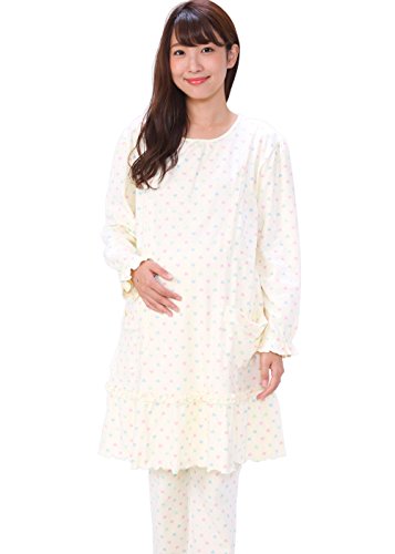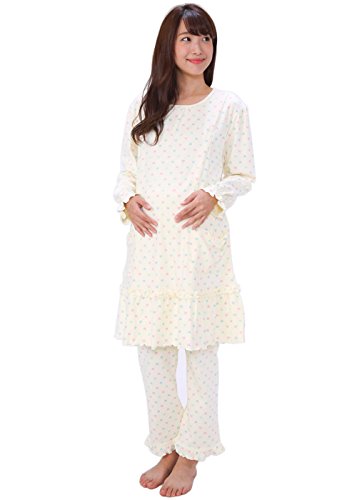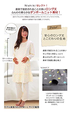 37604 パジャマ マタニティ レディース 長袖長ズボン かぶり 授乳口付 産前産後 ロング丈 ダンボールニット素材 綿100% ハート柄 【2アイボリーM~L】