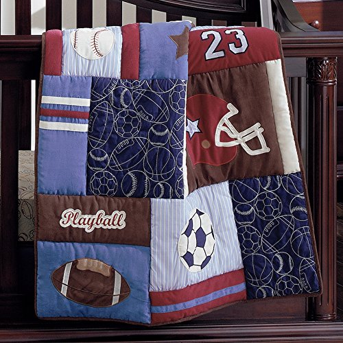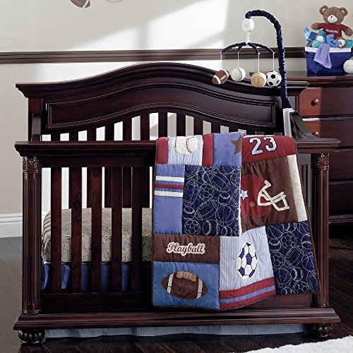 Dimensions: Sheets and Dust Ruffle fit standard crib mattress: 28 x 52 inches; Comforter: 33 x 45 inches; Valance fits standard 36 x 48-inch window;Make every day 'Game Day' in your baby's nursery with this sports-themed set;Sheets: 100% cotton; Comforter and Dust Ruffle: Combination of cotton and polyester fabrics; Valance, Diaper Stacker and Wall Art: 100% polyester;Includes 1 comforter, 2 fitted crib sheets, 1 dust ruffle, 1 diaper stacker, 1 window valance, and 3 wall hangings;Machine wash cold, tumble dry low