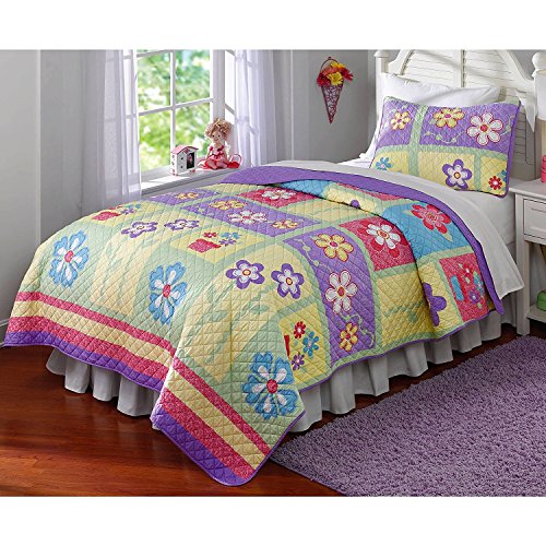 - キッズ女の子ピンクレッドパープルイエローグリーンフルクイーンキルト3点セット、フラワーベッドに明るいデイジーパッチワーク可愛いスタイリッシュの楽しいスイートかわいいエレガントガーデン、コットン、マイクロファイバー