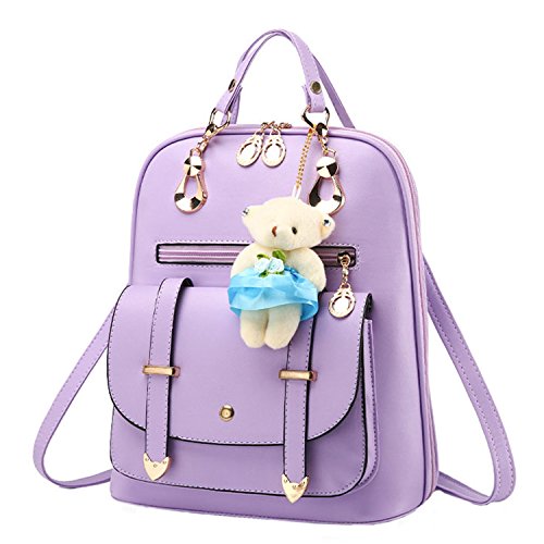 NOTAG リュック PUレザー リュック ショルダーバッグ 女性ハンドバッグ 肩掛け 斜め掛け 3way レディース バッグ クマちゃん付き 高校学生 人気 通勤 通学 用 に (パープル)