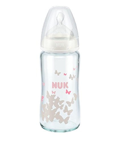 NUK FIRST CHOICE+ Glass Baby Bottle 240 ml Size 1 Medium 0 - 6 Months with Anti-Colic Teat Made from Silicone for Milk Feeds by NUK