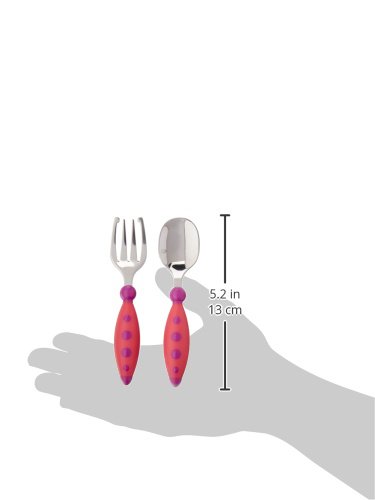 Safely introduces toddler to utensils;Wide, easy-grip handles for little hands;Rounded fork tines for extra safety;Includes(1) fork, (1) spoon;Dishwasher-safe and BPA-free