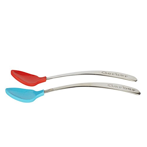 Soft, silicone tip gentle on teeth and gums;Longer, curved handle makes feeding baby easier and more comfortable;Durable stainless steel handles;Includes (2) spoons in assorted colors;Dishwasher-safe and BPA-free