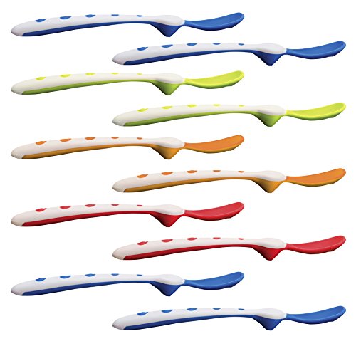 Rest Easy support keeps germs off the spoon and mess off the table;Spatula edge helps wipe food from baby's face;Super soft tip gentle on teeth and gums;Long handle reaches bottom of tall jars;Includes 10 spoons in assorted colors, For 4m+; BPA free & Dishwasher-safe