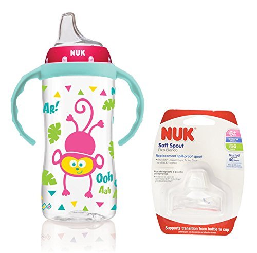 Includes 1 NUK Large Learner Cup, 10 Ounce & 1 NUK Replacement Silicone Spout, Clear;For babies who need a larger learner cup but aren't ready for a sippy cup;Easy grip, anti-slip handles are easy for baby to hold and removable as baby ages;Spill-proof, soft spout is designed to be gentle on gums while teaching baby to drink from a spout;Air vent helps reduce swallowing air