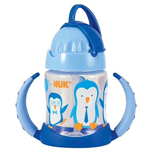 Helps make the transition from bottle to straw cup easier with the easy-to-use spill-proof NUK Straw Learner Cup with adorable dancing penguin design;Unique wide oval silicone straw is angled forward making it easier for your baby to drink and gentle on their gums;Flip top lid with integrated loop keeps straw clean when not in use and great for on-the-go;Easy-grip, anti-slip handles are easy for baby to hold and removable as baby ages;Liquid flows easily through straw when sipped