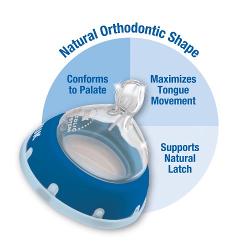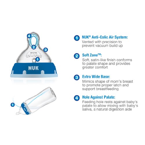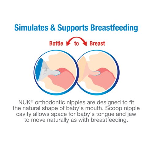 Latest breakthrough in orthodontic nipples;Features advanced NUK? orthodontic nipple that supports healthy oral development and features Soft ZoneTM for greater comfort;Natural shape nipple mimic's Mom's nipple shape so you can combine breast and bottle feeding;Features the advanced NUK? Anti-Colic Air System which helps to reduce colic;Supports combining breast and bottle feeding
