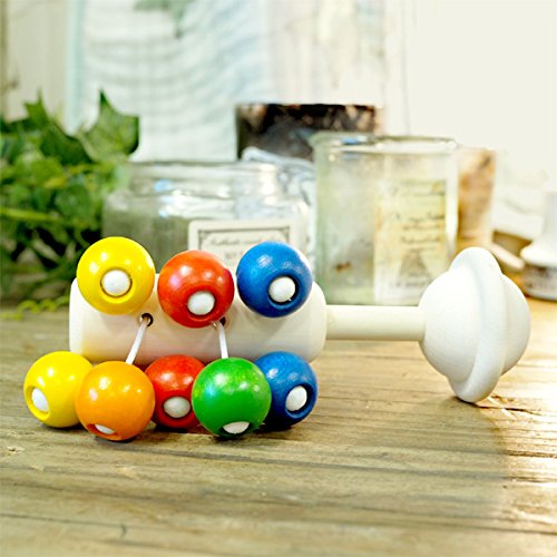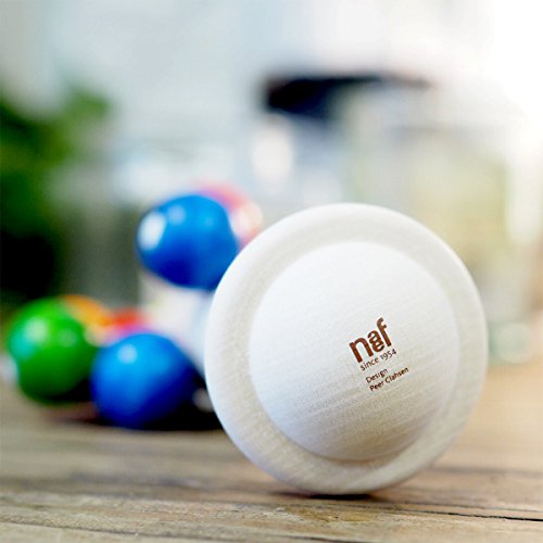 スイス・Naef(ネフ社)の「ドリオ」は、ドイツの造形作家ペア・クラーセンがデザインした贅沢な木製おしゃぶりラトル(ガラガラ)です。 視覚、聴覚および咀嚼(そしゃく)能力を刺激する美しいデザインやフォルム。木材はカエデ材を使用しています。 「ドリオ」は、ぶどうをイメージしてデザインされたユニークなラトルです。 ぶどうを彷彿させるカラフルな木製ビーズが10個ついていて、賑やかなデザインになっています。 振ると広葉樹のカエデならではの乾いて落ち着いた心地よい音がします。 木製ビーズは、しっかりと固定されていますので、赤ちゃんも思いっきり舐めたり、噛んだりしても大丈夫ですので、おしゃぶりとしても使用できます。 赤ちゃんは目と耳、そして口で様々な経験を得られます。 「ドリオ」の重さは約50gと、他の木製ラトルに比べて若干重さがあるので、はじめのうちはお父さん・お母さんが優しく振って見せてあげてくださいね。 持ち手を含めて全体のデザインは、落としても危なくないように丸みをもたせています。 楽しくて、美しくて赤ちゃんの初めての木のおもちゃとしてオススメです。