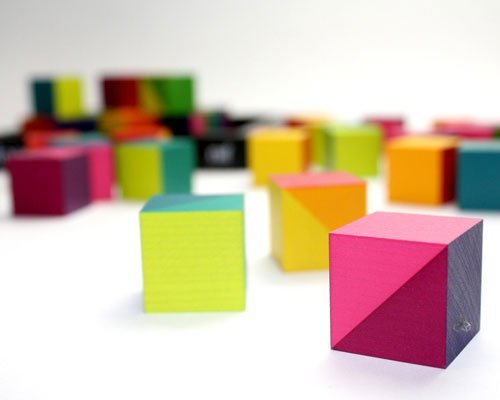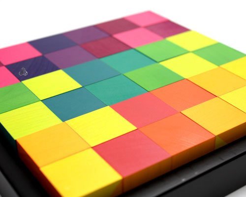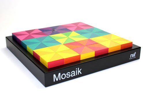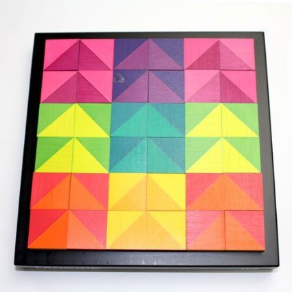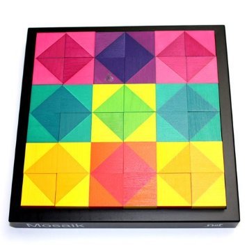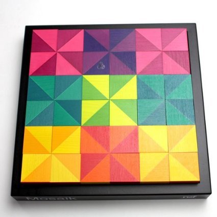 このモザイクは色がたいへん美しく、平面的なモザイク遊びとしても夢中になりますが、パーツ一つ一つが立方体で六面ともにきれいな印刷がなされているので、立体的に遊ぶのもとても楽しいです。