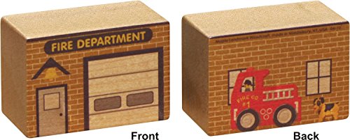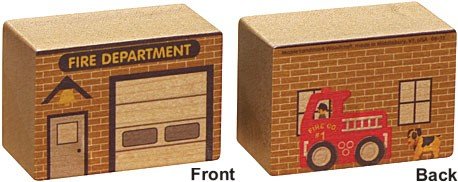 Our solid maple firehouse is a great addition to any track layout. The firehouse is about 3-1/4" high and 6" long. Printed on both sides - the front has a garage door and the back shows Snickers the fire dog. The firehouse is also available in the Town Set.