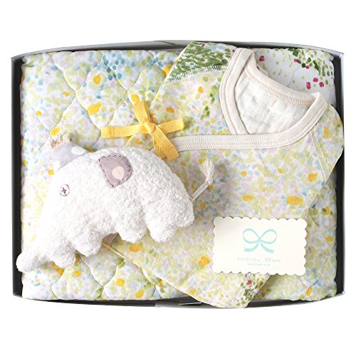 - ガーゼキルトとコンビ肌着、オーガニック素材のがらがらをセットにしたベビーギフトです。