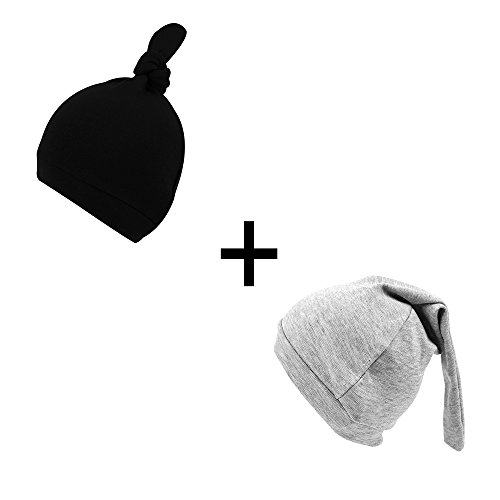 ベビーニット帽子 かわいい 赤ちゃん帽子 肌触りよく ローガニックコットン 無地 男の子 新生児 春 2点セット (グレー・ブラック, 0-6ヶ月)