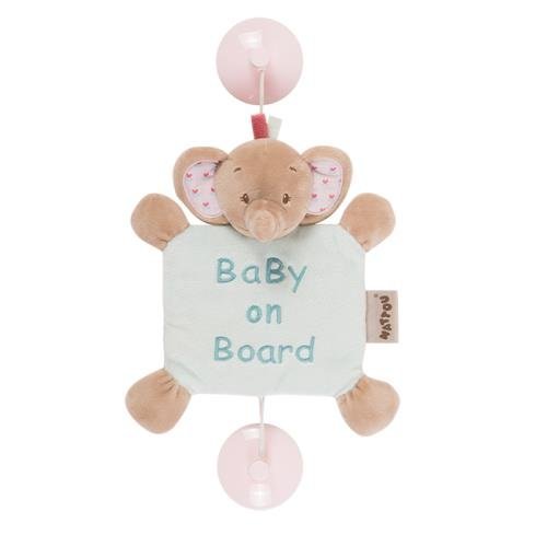 Baby On Board Rose the Elephant;With two suction cups making hanging this sign easy and secure;Made from Nattou's signature soft and snuggly, plush fabric;Nattou's Charlotte and Rose collection Baby on Board car safety sign will lighten up a window in any vehicle;Machine washable at 30 degrees