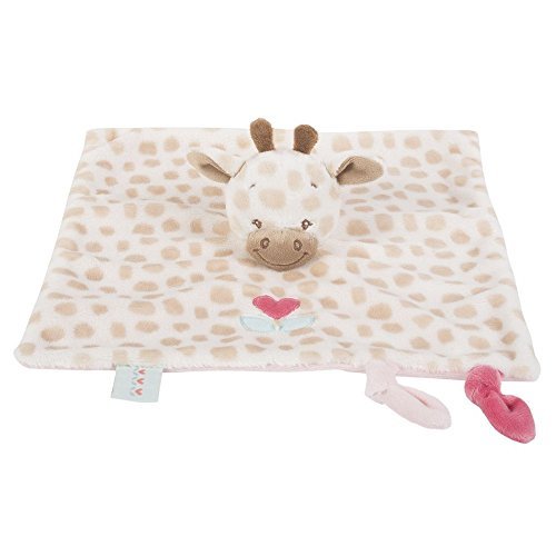 Charlotte the Giraffe on a gorgeous doudou comforter blanket in shades of brown;Embroidered face details. Fluffy tags and knotted tie;Heart embroidery on the blanket;Machine washable;Snuggly and soft fabric