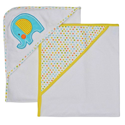 This adorable 2pk set features a whimsical elephant making bath time fun and functional.;The white hooded towel has a large elephant applique with polk-a-dot bias. The multi-color polk-a-dot print hooded towel has solid yellow bias.;Measures 26 x 30;Knit terry