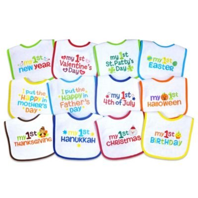 Set of 12 Holiday Bibs;Covers all the major holidays throughout the year;Baby's 1st Year Holiday Bib Set keeps your little one clean and stylish at different holidays their first year;Suitable for age birth up to 24 months