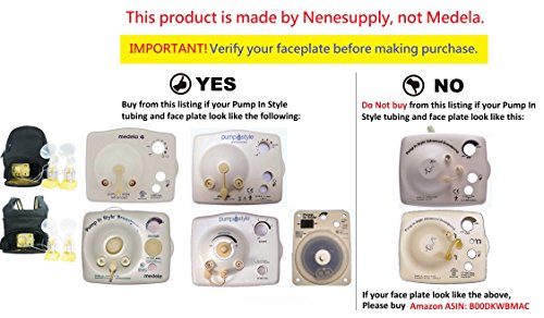 Nenesupply PUMP PARTS FOR MEDELA PUMP IN STYLE Advanced breastpump. 2 Membranes, 2 Valves and 2 Tubing. MADE BY NENESUPPLY. Not Original Medela Pump Parts.;Use with Medela Pump In Style released AFTER July 2006. It will not fit models sold before July 2006. Please verify your face plate before making the purchase.;COMPATIBLE AND INTERCHANGEABLE WITH OEM PARTS. ALL PARTS MADE BY NENESUPPLY. They are interchangeable with Medela breastshields, valves and membranes.;Two 42 long, CLEAR AND TRANSPARENT PLASTIC TUBING with pale yellow adaptor on one end, and soft end on the other. Valves fit snugly onto breastshield connectors. Easy to remove from breastshield.;MATERIALS DO NOT CONTAIN ANY BPA. IN RETAIL PACk. Comply with EU Commission Regulation (EU) No 10/2011 for plastic materials that contact food. Tested by independent labs for safety.