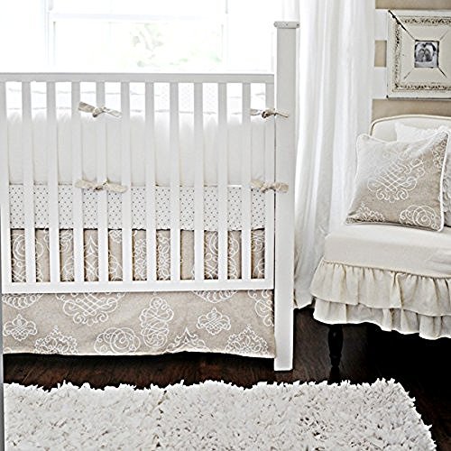 If you are looking for classic and sophisticated crib bedding, this set is for you.?Our beautiful white crib set bumper is made of cotton?white denim?fabric with?natural scroll cording and ties.?Bumper is slip covered for easy cleaning.?Crib sheet is of?petite dots in khaki?fabric. 17' tailored skirt is made of?natural scroll?fabric.?The two piece includes a crib sheet and skirt. The three piece is a bumper, skirt and sheet. the four piece adds a blanket.