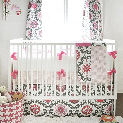 We love this fun medallion pattern in hot pink and gray. Our Rag muffin in Pink crib collection is a perfect, whimsical bedding collection for a baby girl. The bumper is made from White Pique with grosgrain ties and Perfectly Pink Solid cording, and is slip covered for easy cleaning.? The sheet is made?from Itsy Bitsy Dots in Bloom and the 17' tailored skirt is made of Ragamuffin in Bloom fabric. Make it a 4-piece set by adding the patchwork blanket. Handmade in the USA.