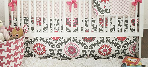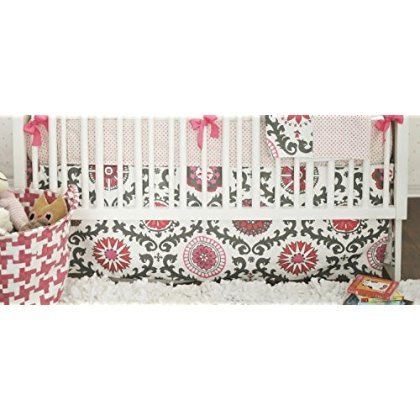 We love this fun medallion pattern in hot pink and gray. Our Rag muffin in Pink crib collection is a perfect, whimsical bedding collection for a baby girl. Two piece set includes a crib sheet and?skirt. The sheet is made?from Itsy Bitsy Dots in Bloom and the 17' tailored skirt is made of Ragamuffin in Bloom fabric. Handmade in the USA.