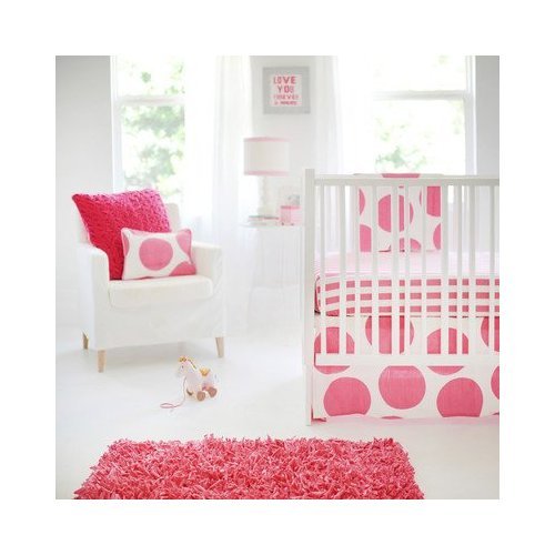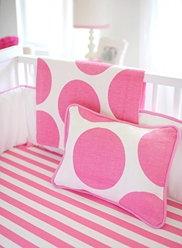 We are having fun with dots. Spot on Fuchsia Baby Bedding will give your nursery a modern, clean look. Crisp white and hot pink lends a fresh feel to your new baby's room. Spot on Fuchsia two piece set includes a crib sheet and?skirt. The?three piece set includes bumper, sheet and skirt. The bumper is made from?White Pique?with hot pink ties and cording, and is?slip covered for easy cleaning.? The sheet is made from our?Hot Pink Candy Stripe?Fabric?and the 17' tailored skirt is made from?Polka in Hot Pink. Make it a 4-piece set by adding the crib blanket, made from Polka in Hot Pink?with flannel backing. Handmade in the USA.