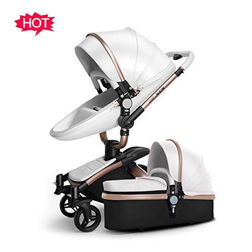 (Newox) ベビーカー 両対面ベビーカー ハイシートベビーカー 座椅子360度回転可能 対面押す可能 エッグデザイン座椅子 上質PU素材 飛行機用アルミニウム合金フレーム 独立揺りかご付き 手ブレーキ機能搭載 買い物かご付き ハンドル(前後、長さ)調整可 ゴム製空気入れなしキャスター (ホワイト)