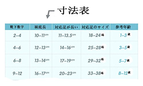 - S(3-5歳)靴下長さ:13cm; M(5-7歳)靴下長さ:14cm; L(7-12歳)靴下長さ:17cm
