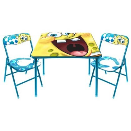 Product Description Nickelodeon Spongebob 3 PC Square Table and Chair SetYour child will love reading, drawing and doing homework around the house at the Spongebob 3 PC Square Table and Chair Set. Featuring the Spongebob design, this table is sure to become a favorite with your little one. The 3 PC Square Table and Chair Set includes 2 folding chairs and a square table. The table is easy care with regular damp cloth wipe down. From the Manufacturer This collapsible SpongeBob table comes with two folding chairs. It's great for children's games and activities or just some extra seating.