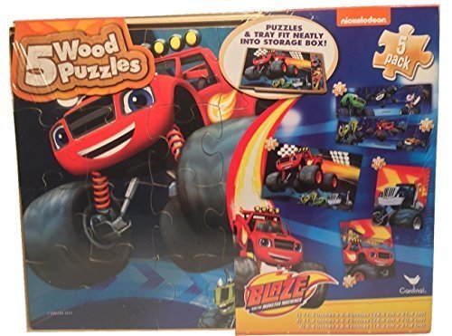 Blaze And The Monster Machines 5 wood puzzles, Featuring Blaze, Zeg, Stripes, Pickle, Crusher and Starla, Beautiful full color graphics, Handy storage so you can build again, Number of pieces per puzzle vary but range from 12 to 18 to 24