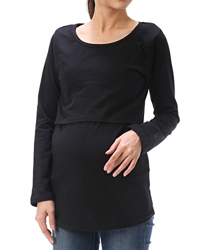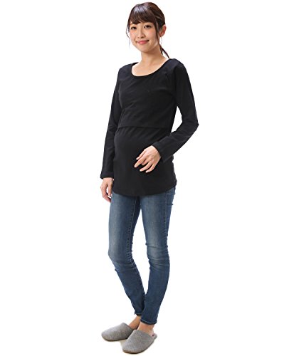 012022 マタニティ トップス カットソー 長袖 授乳口付き 綿95% ストレッチ素材 産前 産後 着たまま授乳 授乳服 妊婦服【ブラック/Lサイズ】