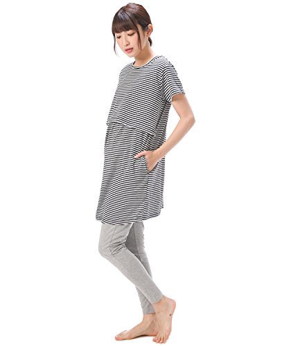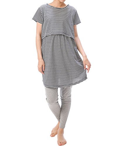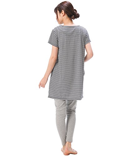 87066 マタニティ 半袖 上下セット カシュクール のびのびウエストパンツ チュニック丈 吸湿 保温 妊婦 授乳 産前 産後 春 夏 パジャマ ルームウェア 寝間着 入院準備【ネイビーボーダー】