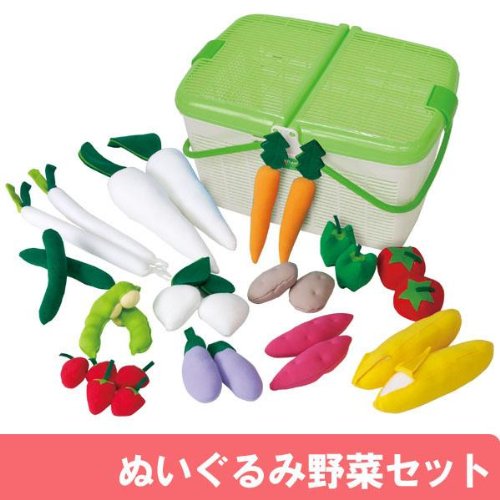 製造国:日本 素材・材質:表面:ホ゜リエステル、中身:綿 商品サイズ:カコ゛:幅375×奥行300×高さ240mm 重量:カコ゛:0.7kg、ぬいぐるみ1セット:0.5kg 仕様:対象年齢:3歳以上 セット内容:だいこん・ねぎ・ハ゛ナナ・なす・さつまいも・さやえんどう・きゅうり・じゃがいも・ヒ゜ーマン・かぶ・にんじん・いちご×各2個、カコ゛×1個