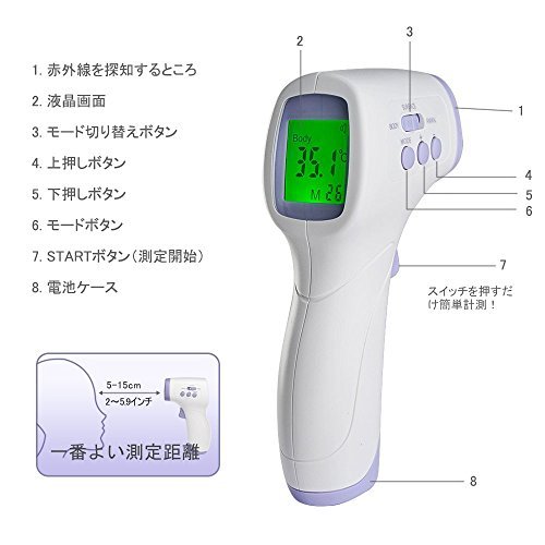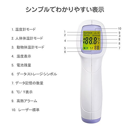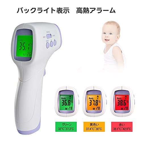 - 「便利・簡単」おでこを5CM~15CM離してスイッチをカチッたったこれだけで温度が測定できます。そして、温度により液晶画面の色が三種類あります。発熱を測定すると、体温計がアラームを鳴らしてお知らせします。
