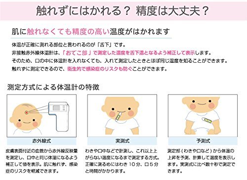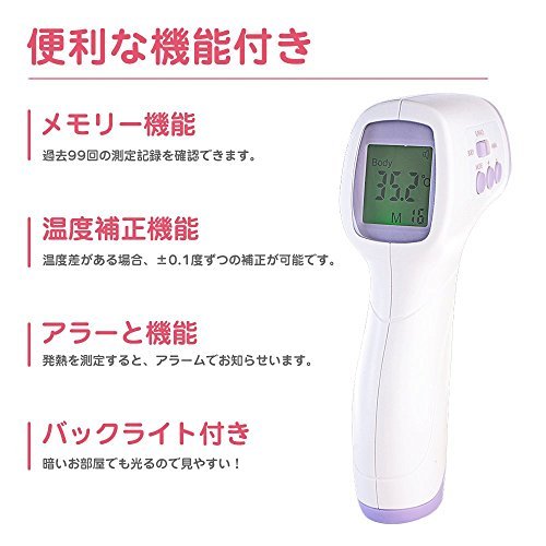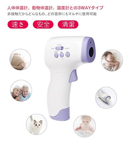 - 「安全・清潔」非接触体温計は肌に直接触れなくて、皮膚表面付近の血管から赤外線反映量を測定し、手早くらくらく検温が出来ます。衛生的に家族みんなで使用できるので、感染症のリスクを軽滅できます。
