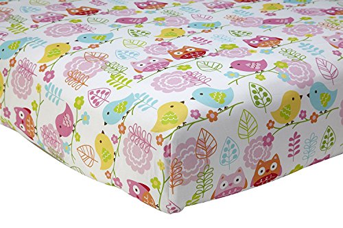 Love birds crib sheet delightful owls and sweet song birds perched on tree branches adorn this lively crib sheet. All over mini print in happy colors of pink, white, raspberry, light blue, orange, yellow, green. Fitted crib sheet fits a standard size crib mattress 28 x 52. 100% cotton fabric.