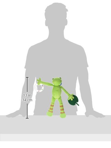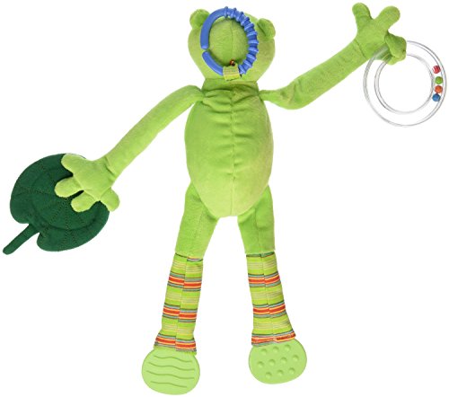 Frog Activity Squeaker is made of soft velour and stripe jersey knit and features engaging tactile elements for baby to explore. This interactive toy has rattle, mirror, and textured feet. Sturdy c ring attaches easily to stroller, car seat, or baby bag for handy fun on the go. Baby safe and machine washable.