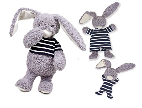 First mates bunny is made of curly soft plush with embroidered facial features and stripe jersey knit. This set includes one 16' bear, one 14' snuggle security blanket, and one 8' rattle. Machine washable and baby safe.