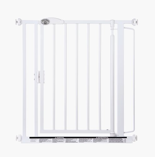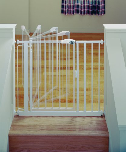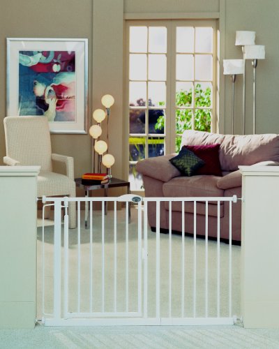 Easily adjusts to fit openings 29.5 inches - 38.75 inches width with one extension (included);A maximum of three (optional) extensions 1, 2, 5 and 11-bar extensions (Sold Separately) can expand gate up to 126.75 inches.Ideal for use at top of stairs or between rooms;Pressure mounted and practically requires no screwing to any wall or door frame. Hardware is required for top of stair application;The mounting cups should be used to ensure the safety and security of the gate.Metal gate opens fully, then automatically shuts and locks;The Auto-Close Gate locks in the center of the gate where the magnets and plastic latches are located. The latch on the bottom of the handle fits underneath the frame of the gate, preventing the door of the gate from being lifted without first releasing the latch. This is an added safety precaution that prevents a child under the age of 24 months from opening the gate.;Please refer the Technical Specification section for further product details