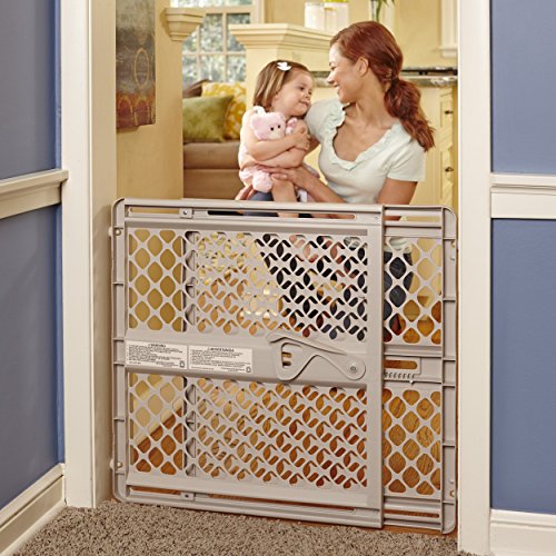 Made in the USA. Keep children safe with the Super gate Ergo. Gate safely contains children and pets in a variety of settings. Designed with this in mind, the North States Super gate Ergo provides secure, effective protection that is ideal for families with multi-story houses. This versatile gate is a beautiful neutral sand color, perfect for any home decor. It is designed to securely barricade doorways, stairways, and other hard-to-block spaces. This gate offer 5 mounting options for versatility. Right out of the box, the Super gate Ergo can be used as a quick and easy pressure mount gate no measuring, hardware, or tools required. Simply expand the gate in the opening and lock the handle. Well-suited to blocking doorways, the gate includes proprietary door sockets that provide extra holding power for pressure mounting it in openings between 26" and 42" wide. Also perfect for barricading hard-to-block spaces, the gate includes rail sockets that let you mount it between two railings or between a railing and a wall. The gate can also be used as a hardware-mounted swing gate, perfect for highly used areas such as the kitchen and living room. With the gate's smooth, rounded edges, opening and closing it is quick, easy, and pinch-free. Finally, unlike some other gates on the market, the Super gate Ergo is certified for mounting at the top of a stairway and includes the necessary hardware to do so.