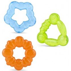 Nuby 歯固め それぞれの中に水が入っているので、冷蔵庫でひやすと、冷たくなります。